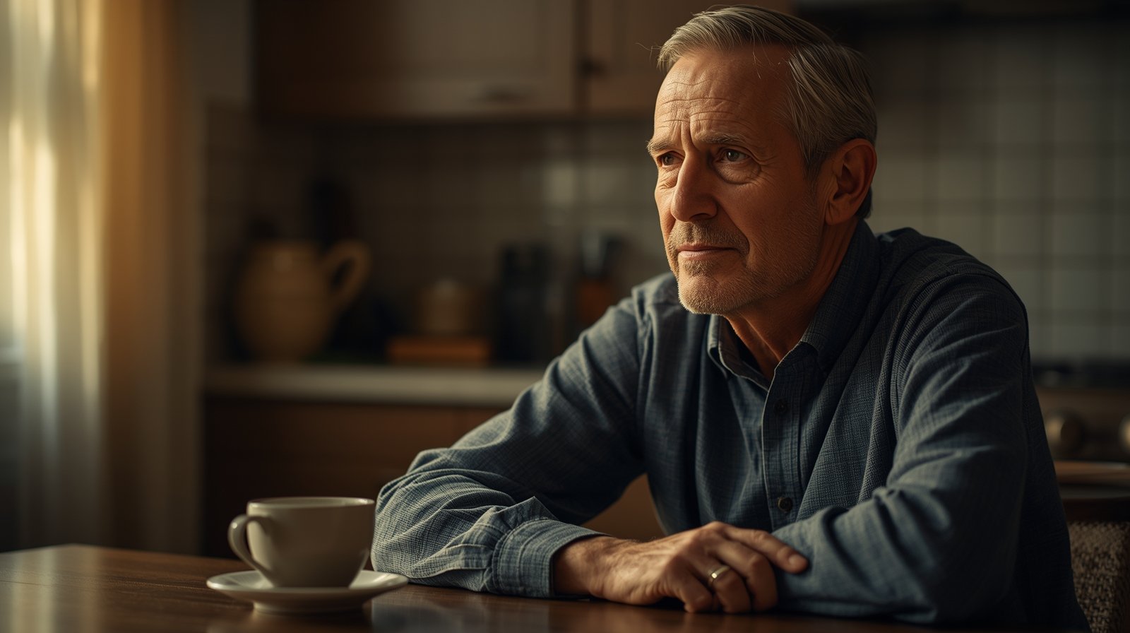 Reflective senior man in a cozy kitchen with coffee cup, deep in thought.
