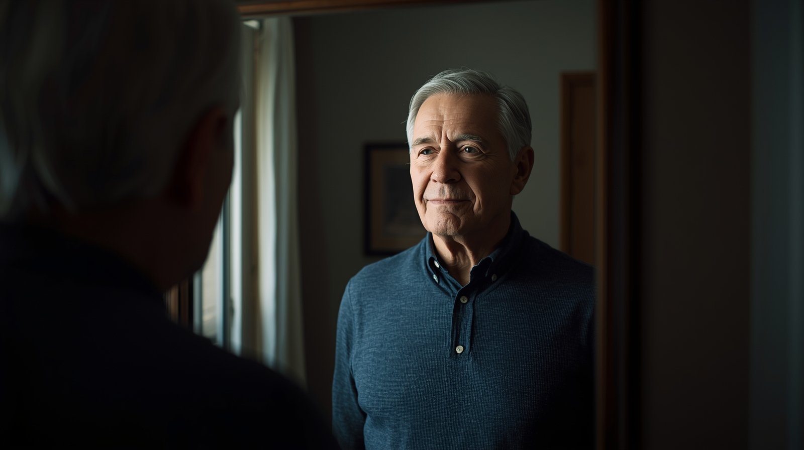 Older man reflecting on aging gracefully at home.